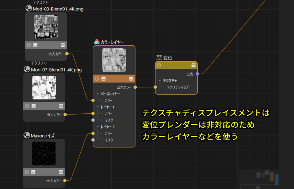 また,現在のところ「変位ブレンダー」によるテクスチャ合成はできません.したがって,カラーレイヤーやカラー合成ノードを用いてテクスチャを合成した結果を変位ノードへ渡して使用します.