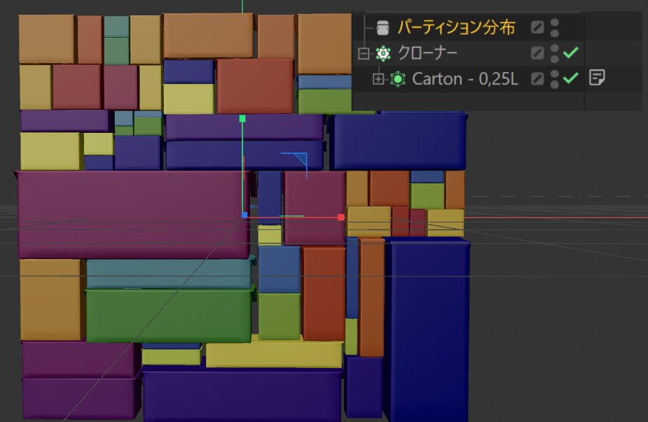 パーティション分割されたスペースにクローンを敷き詰めていくタイプです.これまで難しかったトラックの荷台に詰めるような配置を簡単につくれます.パーティションの生成やパターン自体をアニメーションさせるとモーショングラフィックス的にも興味深いものが作れると思います.