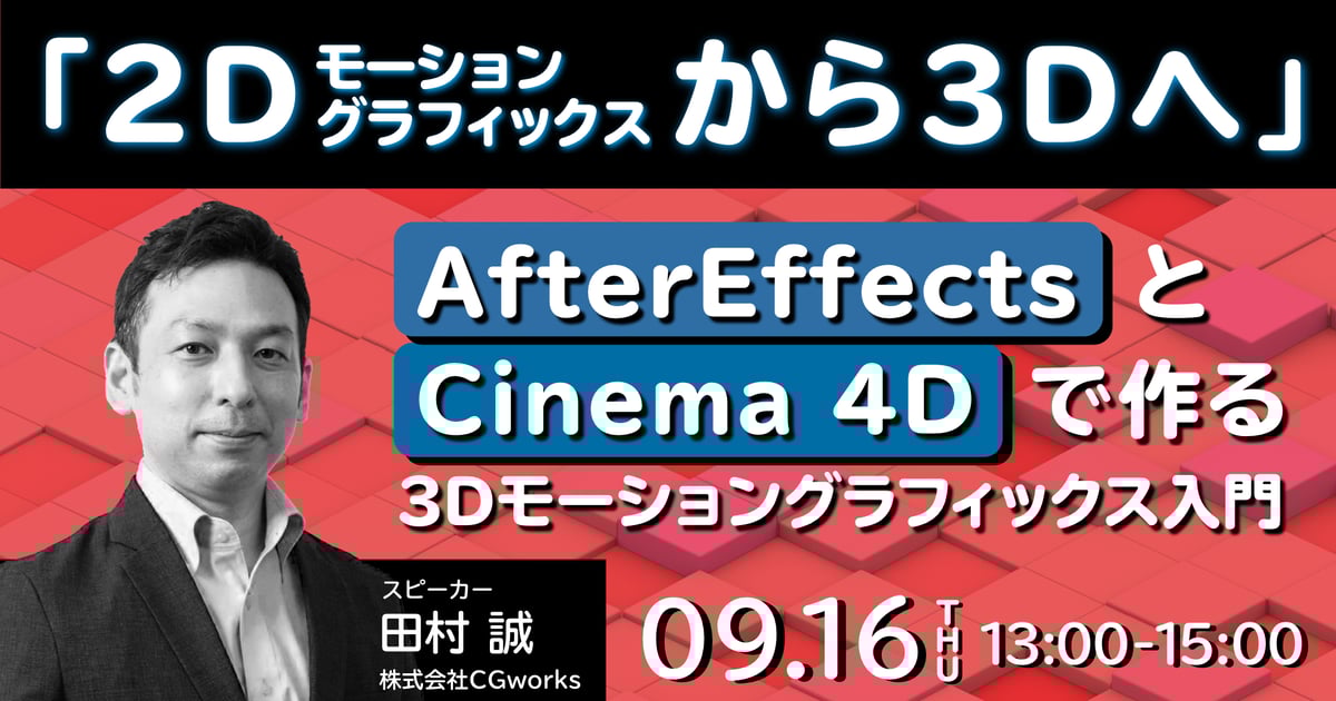 After Effectsで作成した2DモーショングラフィックスをCinema 4Dと連携させて3Dモーショングラフィックスに発展させるハンズオン形式のウェビナーです。 3DCGソフトは多機...